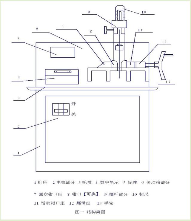 寧夏綠水青山試驗(yàn)機(jī)有限公司W(wǎng)JJ-6/10型機(jī)動(dòng)彎折試驗(yàn)機(jī)/反復(fù)彎折試驗(yàn)機(jī)/鋼筋反復(fù)彎曲試驗(yàn)機(jī)采用立式整體結(jié)構(gòu),(如圖一)主要由機(jī)座1,電控部分2,托盤3,觸摸屏控制顯示部分4,標(biāo)牌5,傳動(dòng)箱部分6,固定鉗口座7,鉗口8(可換),擺桿部分9,標(biāo)尺10,活動(dòng)鉗口座11,螺母座12,手輪13等零部件組成。